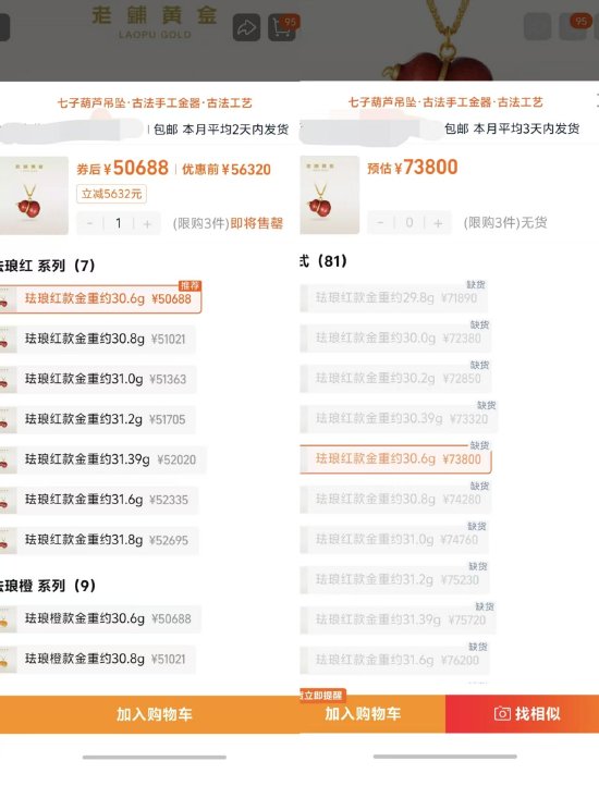 但值得精明的是,M6体育也有部分产物涨幅跳跃了30%。《贵圈》栏目查询发现,一款金重约30.6克的七子葫芦吊坠,在老铺黄金天猫旗舰店调价前为56320元,调价后为73800元,涨幅超31%。