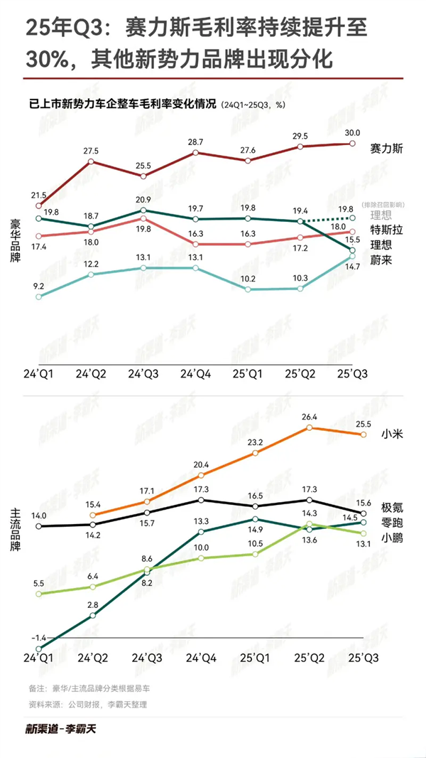 要知谈,咫尺大大量新势力品牌的毛利率,齐在 10-20% 之间,比如特斯拉是 18%,理思在 20% 驾驭,蔚来则只须 14.7% ,和它们比,赛力斯雅雀无声就活成了各家车企梦中的情景。