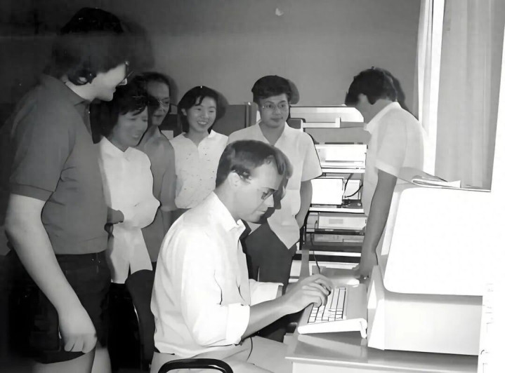 1987年9月14日晚,十几位中、德两国科学家围在一台西门子7760大型狡计机旁,试发中德第一封电子邮件。