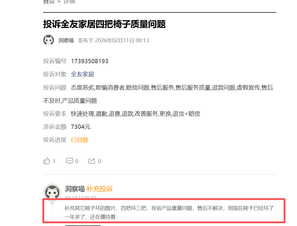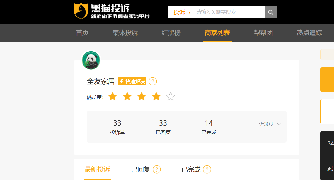 乐居财经 李兰 2月28日,据黑猫投诉 【下载黑猫投诉客户端】平台,全友家居近一个月新增投诉量33条,已完成14条,投诉问题触及产品性量及售后奇迹等。