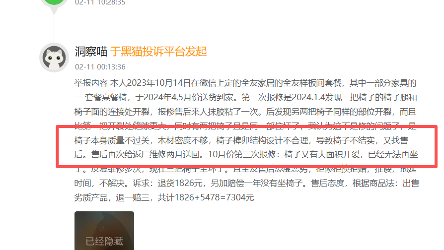 {jz:field.toptypename/}一位花消者反馈,其于2023年10月在微信凹凸单全友家居样板间套餐,包含一套餐桌餐椅。据该花消者刻画,2024年1月初度发现一把椅子腿与椅面一语气处开裂,报修后售后东说念主员摄取抹胶神气进行维修。尔后,开云体育另外两把椅子一样部位出现开裂,且罅隙更大。