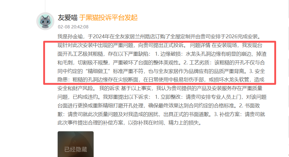 另又名花消者孙金瑜反馈,其于2024年在全友家居兰州路店订购全屋定制产品,2026年完成装配。其在投诉中称,现场发现台面开孔工艺存在以下问题:水龙头孔洞角落有崩边、掉渣和毛刺,切割不规整。该花消者建议更换或重新打磨开孔、书面致歉及抵偿有筹划的诉求。该条投诉经由为已复兴。