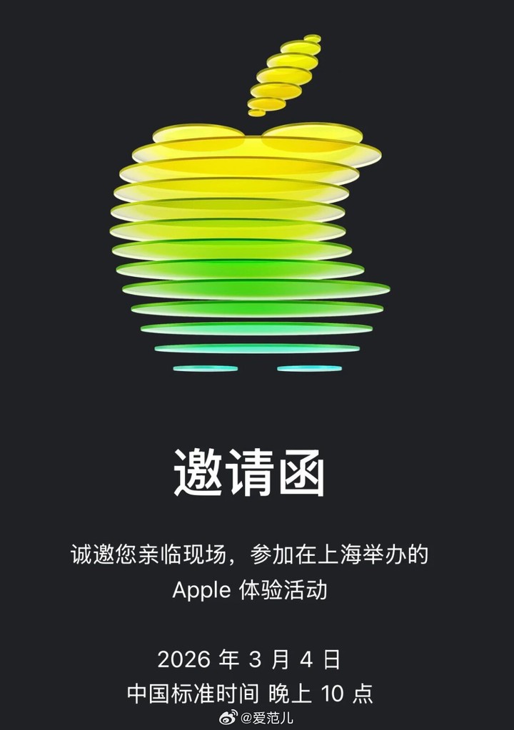 另外,在除夕夜当晚,爱范儿收到了来自苹果的邀请函,官宣将于 3 月 4 日晚 10 点举办 2026 年的首场发布会。