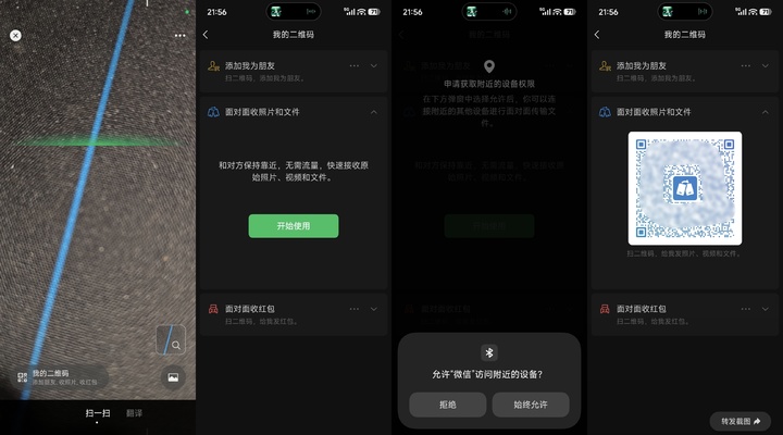 据咱们不雅察发现,微信近期在扫一扫界面上线了一个「我的二维码」专区,进入后不错看到,除添加好友外,微信现还维持面对面收像片、文献以及红包。