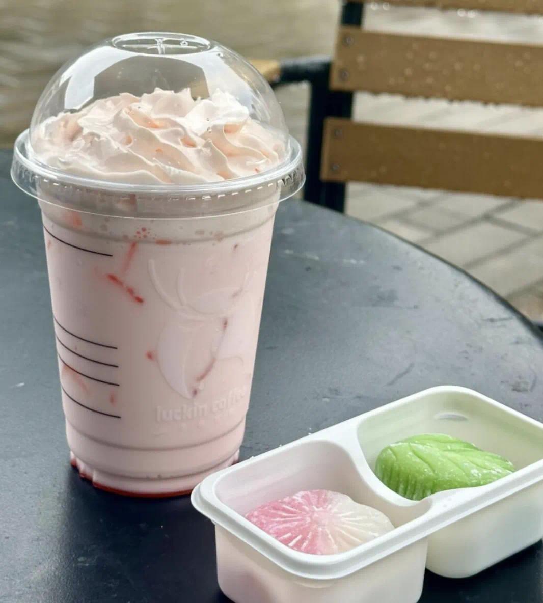(瑞幸的珞珈樱花拿铁和双拼大福。小红书用户@小风奶茶日志)
