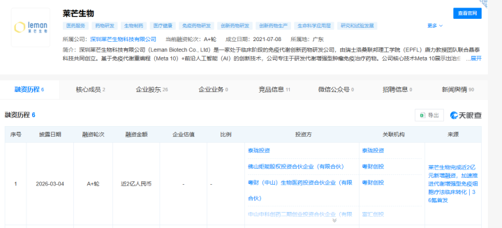 投资界(ID:pedaily2012)3月4日音信,莱芒生物近期已完成近2亿元新增融资。本轮融资由粤财控股旗下机构粤财中垠鸠集晶泰科技领投,矿世之星、MonyValley、泰珑投资、中山创投、以及个东说念主财务投资者跟投,老股东富汇创投握续加注。召募资金将重心用于鼓励极低剂量代谢增强型CAR-T细胞药物的注册I期临床磋磨,并加快鼓励自动化坐褥工艺研发与考据,以及运行代谢增强型实体瘤细胞援助药物的临床飘浮。