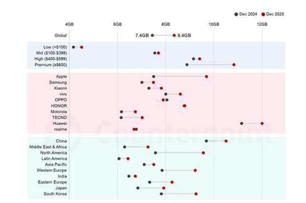 快科技3月2日音信,调研机构CounterPoint Research发出的最新论说线路,2025年12月群众智高手机平均内存(DRAM)为8.4GB,创历史新高。