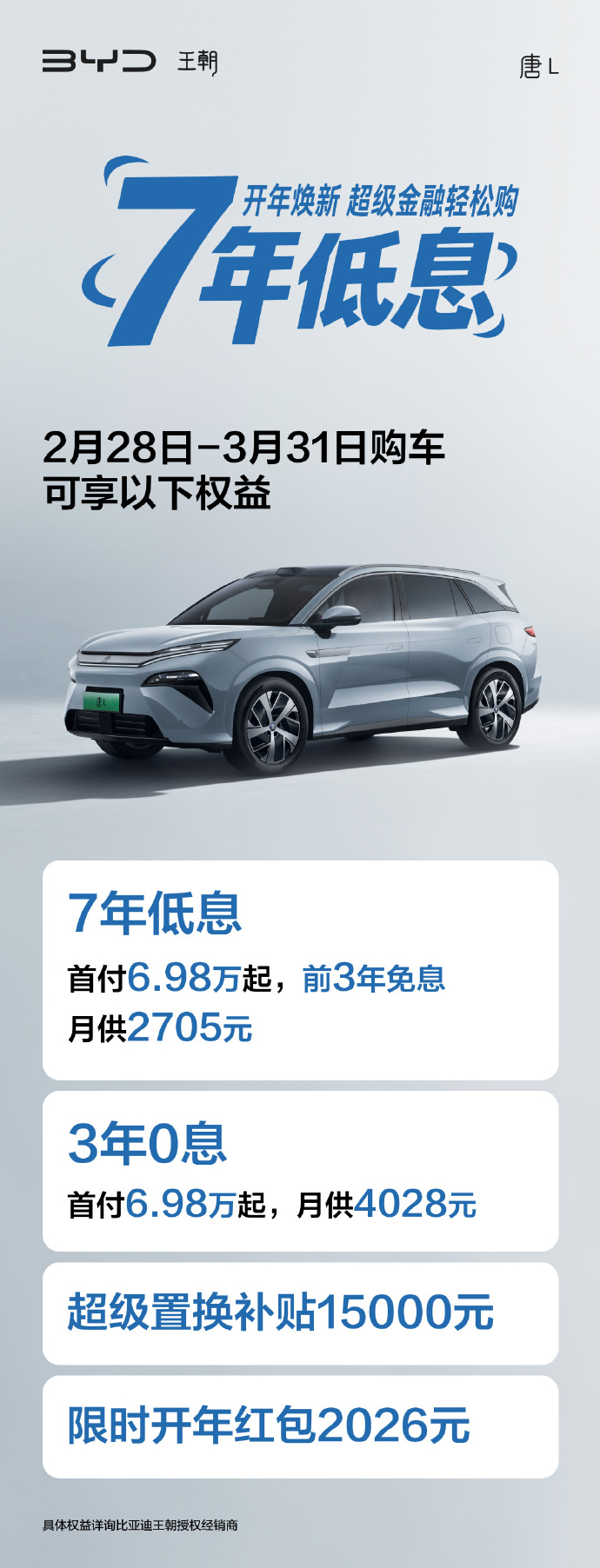 IT之家 3 月 1 日讯息,比亚迪当天公布汉 L、唐 L 限时购车权利,首付 6.98 万元起,提供 7 年低息、3 年 0 息。