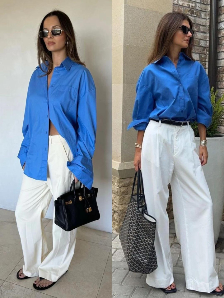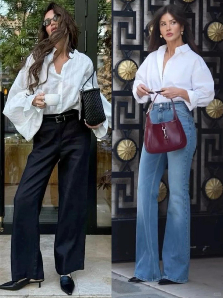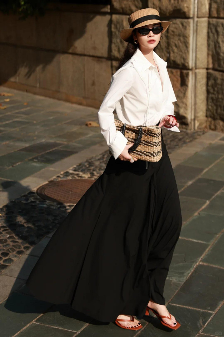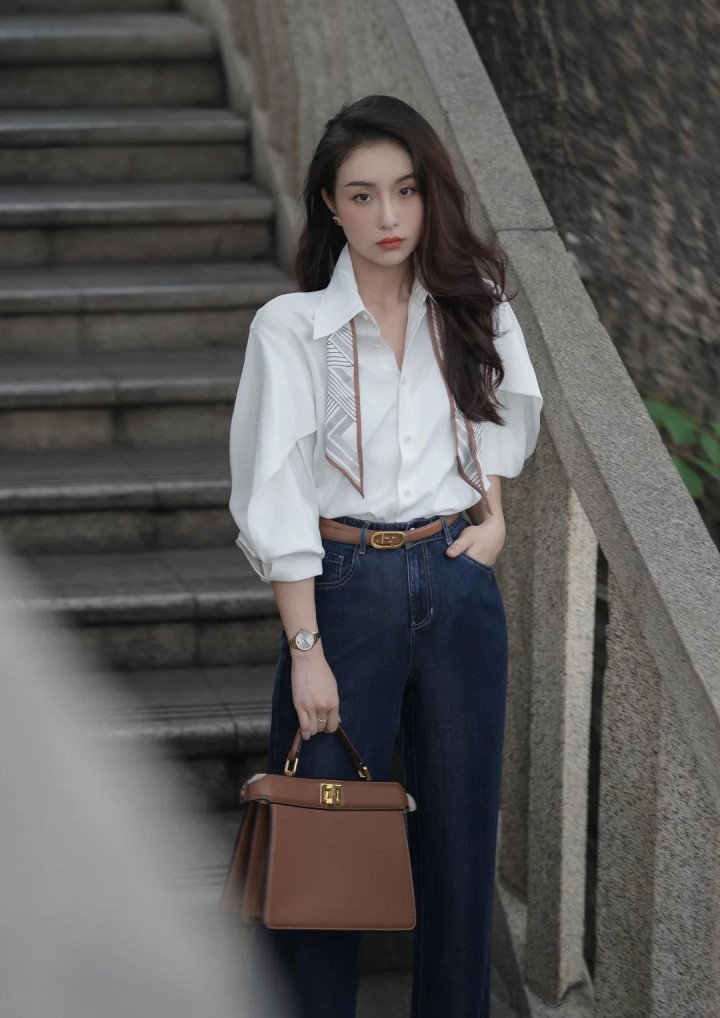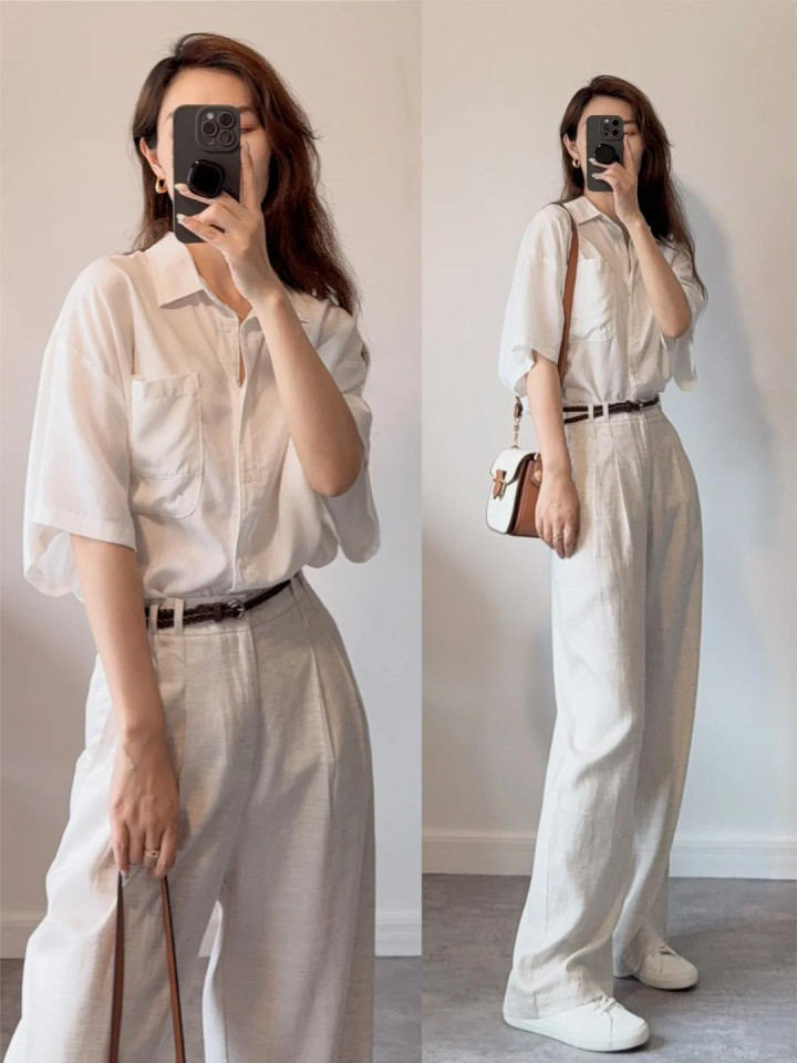 经典永流传,白色勤俭衬衫搭配玄色直筒西裤,是职场不败的选拔。衬衫选有挺括感的棉质或混纺面料,塞进西裤提高腰线,显高又干练。