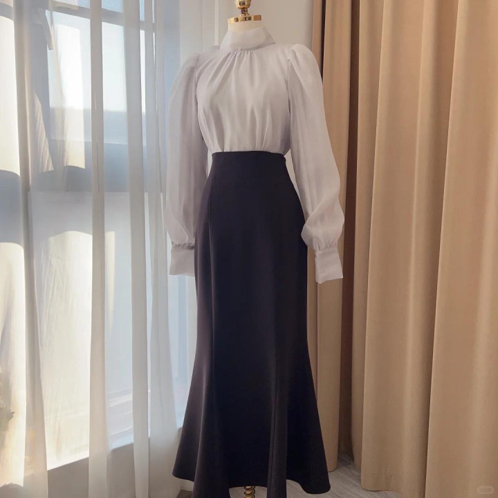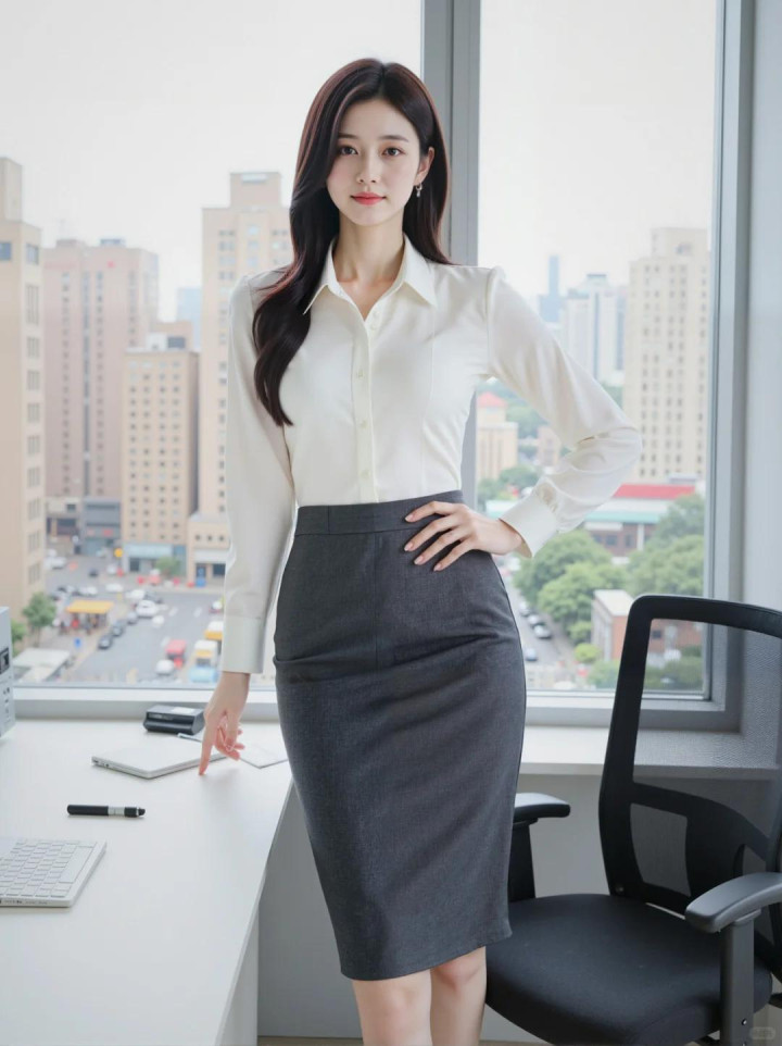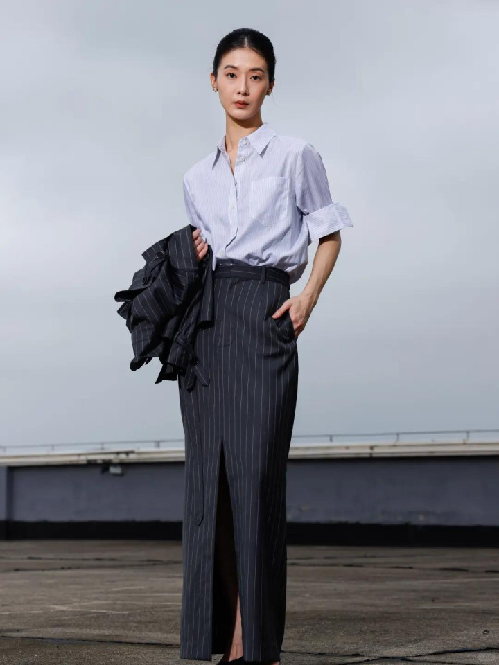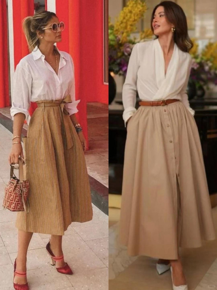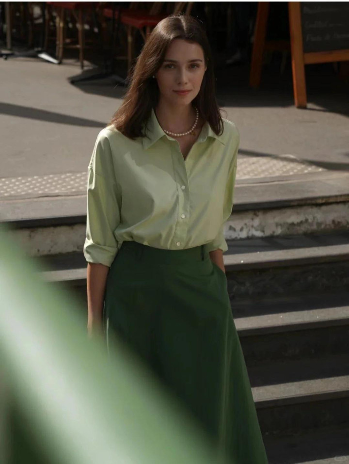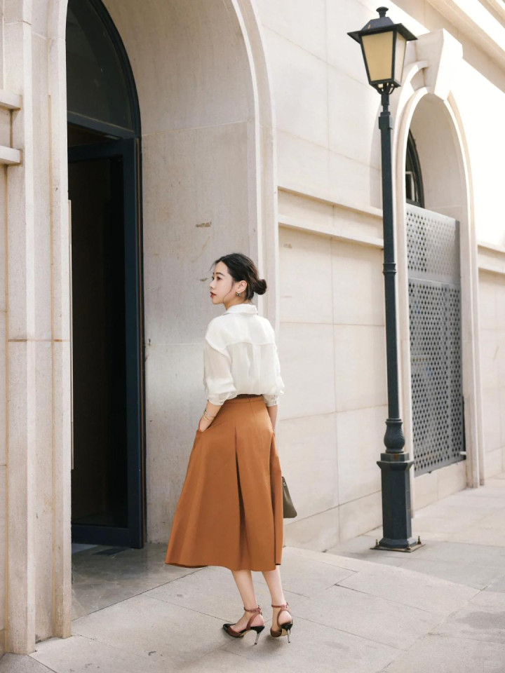 选拔勤俭的纯色衬衫,如淡粉色、浅卡其色,搭配同色系或对比色的 A 字半裙。A 字半裙或者修饰臀部与大腿线条,展现优雅与活力。比如淡粉色衬衫搭配藏青色 A 字半裙,低调又吸睛。