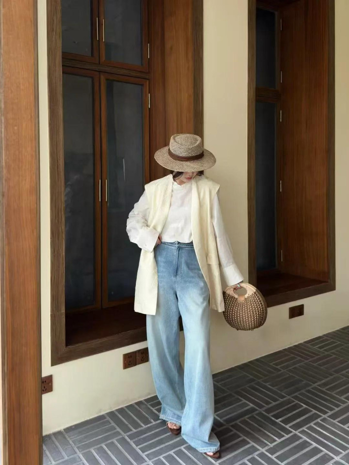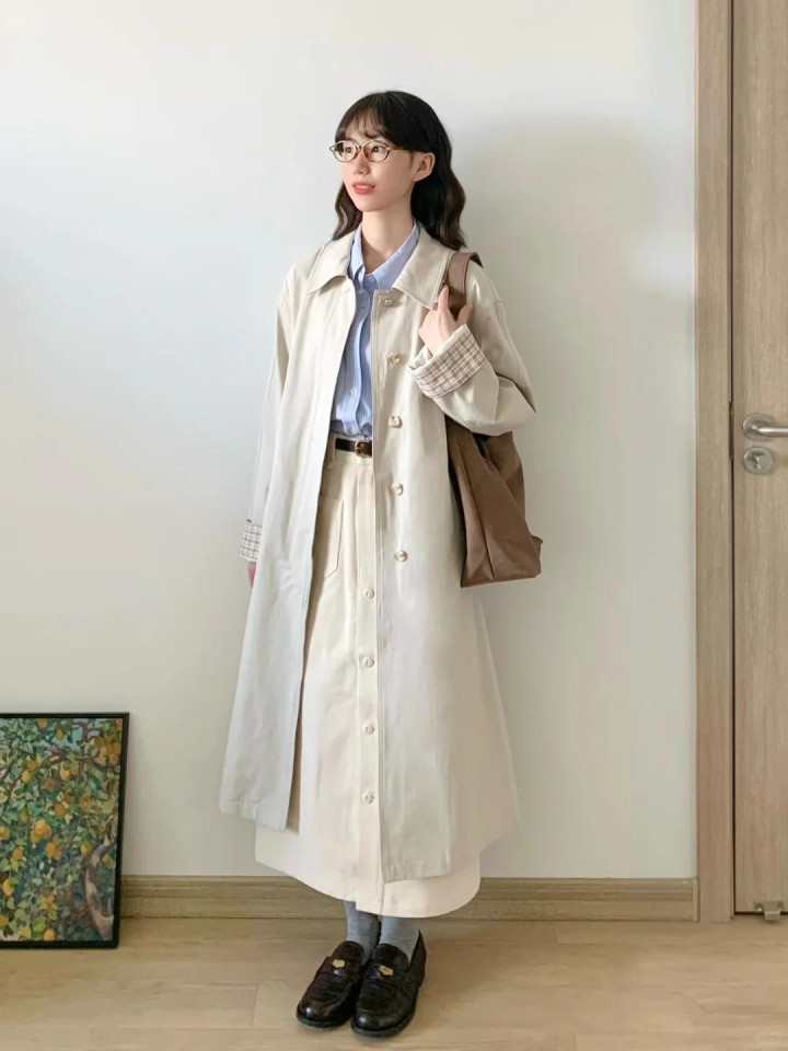 小白鞋悠然安宁,薄款古道开衫选豆沙色或浅灰色,御寒又优雅。