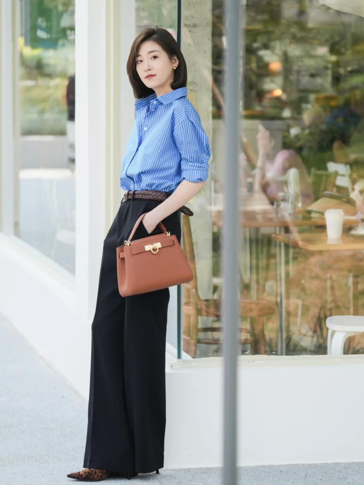 搭配棕色皮革手提包普及细致度。还不错在衬衫外加一件白色的无袖古道马甲,加多档次感,打造逍遥慵懒又不失专科的氛围,相宜创意型职场环境。
