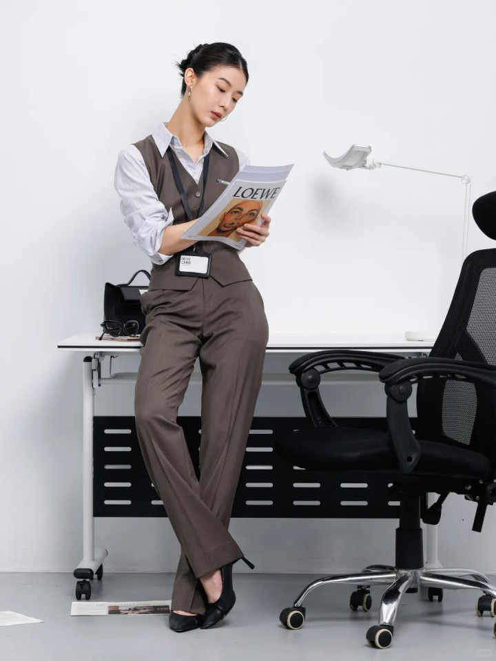 低跟皮鞋选玄色或棕色,步碾儿带风,尽显精英范。系彩色丝巾,如酒红色或墨蓝色,用三角结或平结增添亮点与优雅。