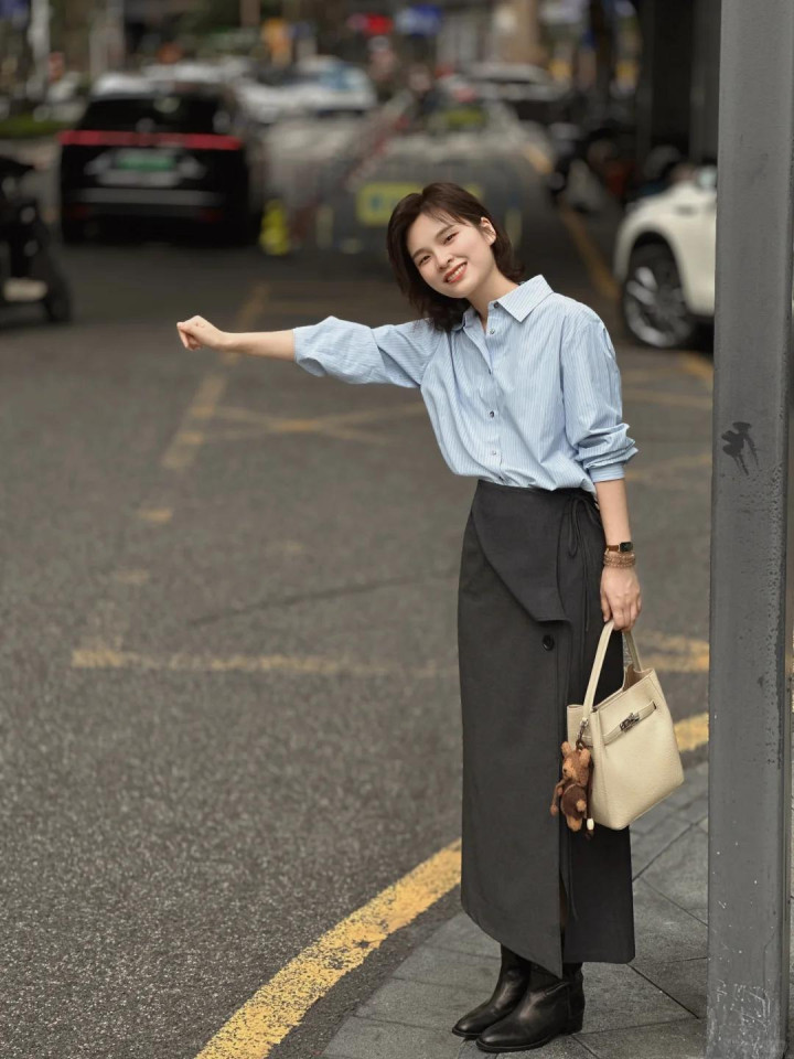 淡蓝色衬衫配米白色伞裙,柔和新鲜。淡蓝色彰显温婉魔力,米白色伞裙裙摆摇曳生姿。