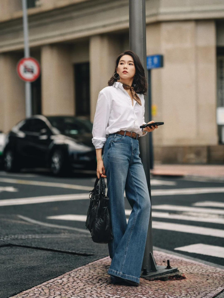 宽松牛仔阔腿裤搭配修身白衬衫,M6体育app衣角草率塞进裤子,营造不经意的漂后感。