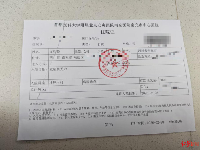 2月28日,文欣悦独自一东说念主到王人门医科大学附属北京安贞病院南充病院(南充市中心病院)查抄,后被确诊为“重症肌无力”。文欣悦说,磋磨查抄讲明泄漏是MuSK抗体,属于重症肌无力“荒僻中的荒僻”,调停十分穷困。