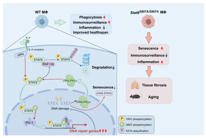 2026 年 2 月 24 日,北京大学第三病院呼吸与危重症医学科双聘陶冶、北京大学改日技艺学院邱义福陶冶团队相聚孙永昌陶冶团队,在Nature Communications发表题为 “DNA-PK-mediated phosphorylation of STAT6 establishes a non-canonical type 2 immunity axis to prevent macrophage senescence” 的商论说文。该商议揭示了调控巨噬细胞病弱的DNA-PK/STAT6/PU.1非经典2型免疫分子轴,初次在体内模子与临床样本中阐发该通路十分与肺纤维化、慢阻肺病(COPD)的发生发展密切干系,为病弱干系慢性呼吸疾病的靶向箝制提供了重要表面依据与潜在分子靶点。