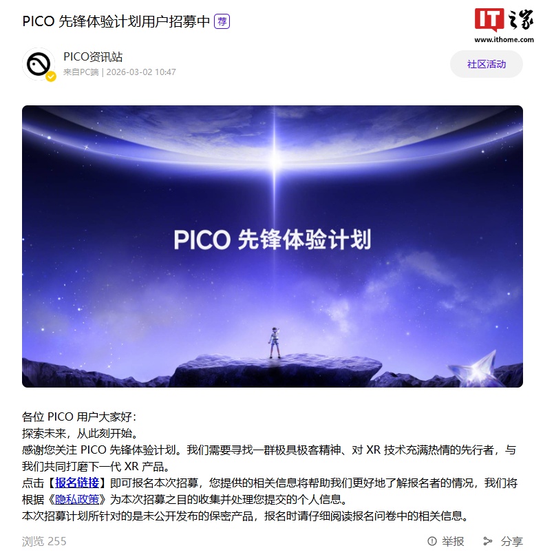 当今,PICO 官网已开启「PICO 公共时尚体验打算」,招募公共 XR 用户参与 Project Swan 和 PICO OS 6 的闭塞测试。